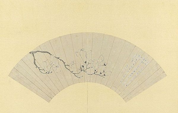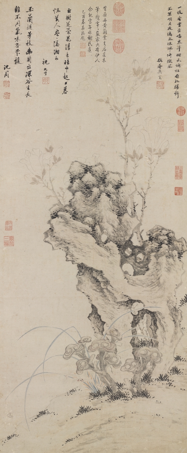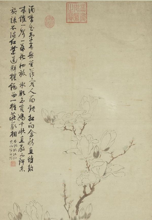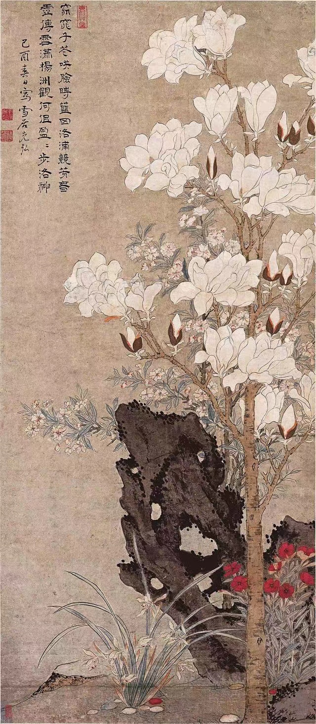项圣谟行书题跋:(第一则)美人䜩罢酒初消。凌乱云鬟压步摇。莫遣翠禽啼梦断。要留香艳托春娇。素娥绰约髩云斜。(第二则)相映红枝上苑花。对此繁英人欲醉。知谁更着好诗夸。包山酉室。吴下名家。偶成合璧写生。率题二截句。古胥山樵项圣谟。 明 宋旭 《木兰》 宋旭(1525—1605年以后),浙江嘉兴人。字初旸,号石门,后为僧,法名祖玄,又号天池发僧、景西居士。善山水,师法沈周,山石树木,苍劲古拙。万历间名重海内。本幅为“明人便面”册第十八开。木兰一枝自左上隅斜伸入画面,淡墨写枝,白描花瓣,木兰数朵,或含苞、或微绽、或盛放,俯仰之间,逸趣横生。 明 孙克弘 《玉堂芝兰图》轴 本幅自识:“窈窕千花笑脸时,蓝田洛浦竞芳春。虚传雪满扬州观,何似盈盈步洛神。己酉春日写,雪居克弘。”钤“孙允执”白文印、“汉阳郡长”白文印。另有引首章“东郭草堂”朱文印。 己酉为明万历三十七年(1609年),作者时年78岁。钤鉴藏印“姚江陈子受家珍藏”朱文印。 图绘拳石之旁,玉兰、兰花竞相开放。花、石的画法均极工细,玉兰花用粉多次轻染分出浓淡,再用工笔勾勒烘托出花瓣的肥厚白嫩。枝干双勾填色并施以皴擦,极富质感。山石的画法是先以淡墨勾出轮廓,然后用浓淡墨多次晕染,逐渐加深,直至显现出丰富的前后层次及石体的质感。山石玲珑剔透而刚硬,玉兰和兰花婀娜多姿而柔媚。本幅设色明丽温润,层次细腻,变化微妙,典雅端丽,属作者工笔花鸟之佳作。 清 恽寿平 《花卉》轴 恽寿平与王翬是交情深厚的好朋友,两人合作作画,相互题诗,他们之间的情谊,在画坛上传为美谈。恽寿平本来原擅长画山水画,认识王翬以后,见到王翬的山水画,即对王翬说:“此道让兄独步,格耻为天下第二手。”认为王翬的山水画是最好的,除了推崇王翬的艺术成就之外,也谦虚自己的画艺。于是专心致力于花卉画上的研究,以宋徐崇嗣(活动于十世纪)、元赵孟睿1254—1322)、明沈周(1427—1509)、陈淳(1483—1544)诸名家为师法的对象,以没骨花卉闻名,不钩花叶、枝榦的轮廓线,直接用颜色或墨画出花朵叶形,创出独特风格。由于恽寿平是常州人,因此他创的花卉风格,称为“常州派”。