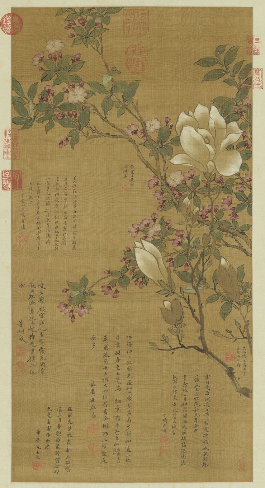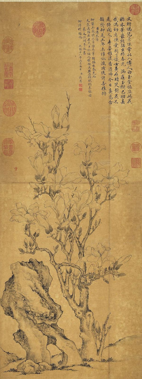 本幅画玉兰奇石,玉兰秀致,奇石玲珑,相映成趣。以工谨双钩法画花朵,花则含苞、绽放各具姿态,通幅以淡墨烘染,更突显玉兰雅淡之美。画成于乾隆十八年(1753),上录御制玉兰诗三首。 清 余省 《春分三候木兰》 本幅有清代名臣庄有恭行楷书题:“御制木兰花诗。江郎才思谢家娇,几许春光着意描。含韵斋中三月半,翠罂银管不相饶。”