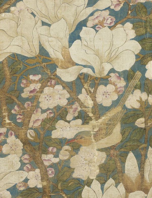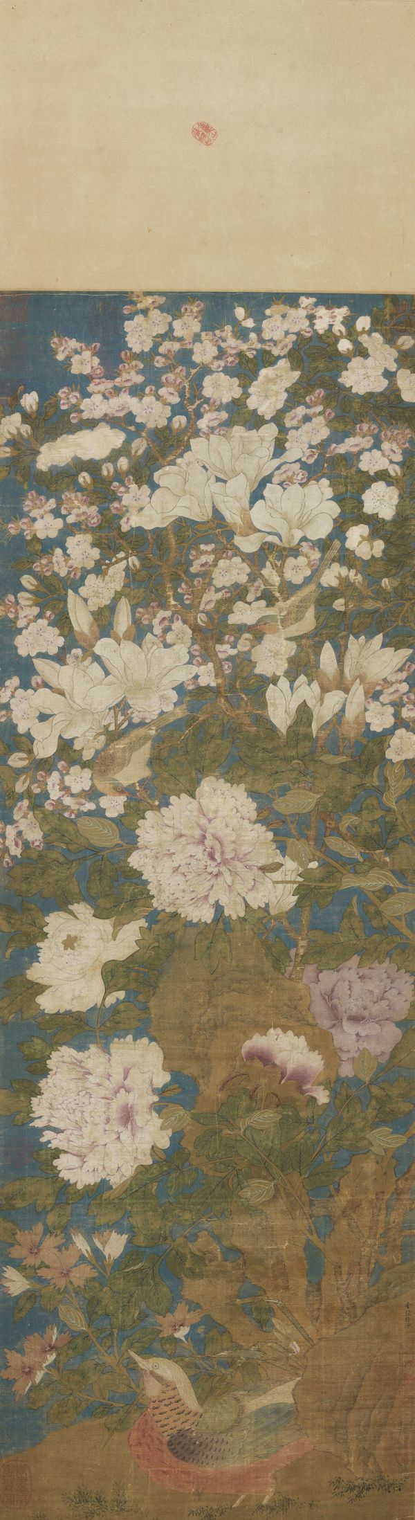 (传)五代南唐 徐熙 《玉堂富贵图》轴 画玉兰、海棠、牡丹、石竹等,花蕊繁复,枝干错综,珍石下一锦鸡,均以双钩填彩方式描绘,工致秀丽。空隙又以石青敷染,画面填满色彩秾艳的景物,极富图案趣味。台北故宫博物院院藏中另有一幅传宋赵昌的“岁朝图”也是同类风格作品,称之为“铺殿花”,原本作为装饰厅堂的屏风画。画幅左下角有“金陵徐熙”款,疑是伪添的。(传)五代南唐 徐熙 《玉堂富贵图》轴 台北故宫博物院藏