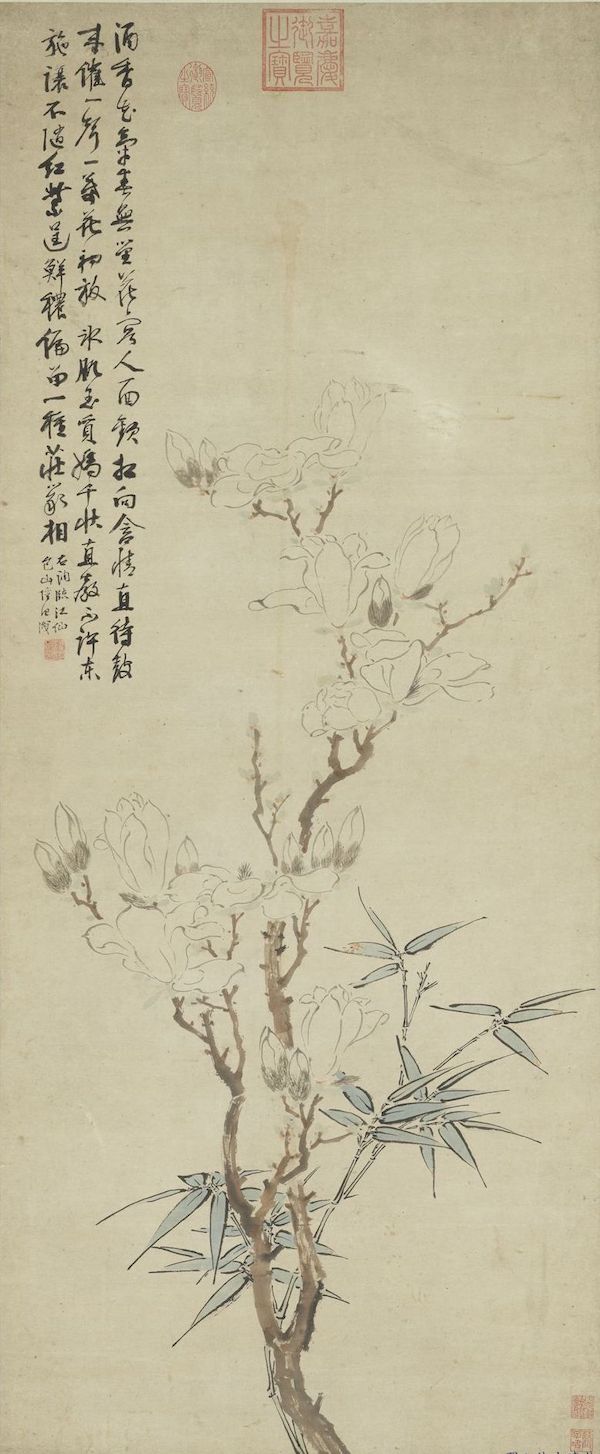作者行书自题:酒香花气春无量,花容人面颜相向。含情直待数来催,一声一叶花初放。冰肌玉质嫣千状,直教不许东施让。不随红紫逞鲜秾,偏留一种庄严相。右调临江仙。包山陆治识。 此幅以玉兰花为主体,一杆劲竹作陪衬,用色只取赭墨、花青,已觉气质高雅出于天然。陆治运用灵活的笔触,钩画出玉兰花柔嫩纯洁的风采,又以坚挺的线条双钩竹杆、竹叶,刚柔相济调和得恰到好处。从画幅上方题词看来,可知玉兰花的洁白和竹子的坚韧在此赋有深一层的意义,陆治可能借此抒怀,将个人的理想投射在笔墨中。明 陆治《玉兰》轴(局部) 台北故宫博物院藏