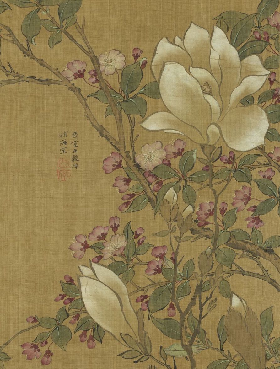 明 陆治 《桃花木兰》 本幅为“明人便面画册(二)”册第七开。玉兰花或盛开或含苞,再配以桃枝。扇面尺幅之间,布局并不复杂,画花卉全以得势为主,画面出枝、开花,上下颇能贯串,一分条畅感,跃然纸上,成画于六十六岁。 明 陆治 王穀祥 《海棠玉兰》轴明 陆治、王穀祥合作《海棠玉兰》轴(局部) 台北故宫博物院藏