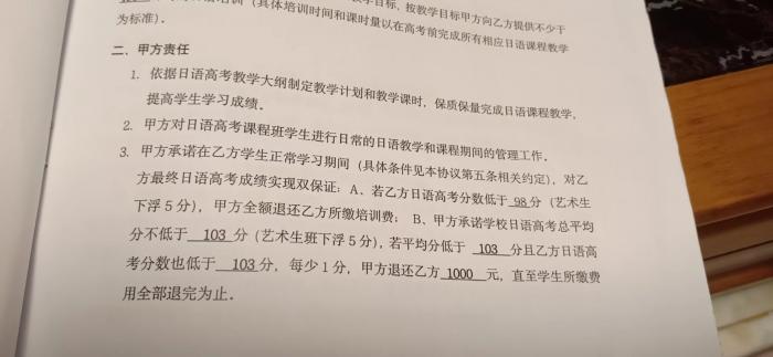 小孩高二时转读日语,交款两万六,对方南渡西留学咨询有限公司。签合同时条款写的清清楚楚:A、学生高考日语成绩不到98分(艺术生下浮5分),机构全额退还所缴培训费。 B、学校高考日语总平均分不到103分(艺术班下浮5分)且学生日语高考成绩也不到103分,每少1分,退还1000元。现此机构以各种理由想少退甚至不退,推脱小孩不认真学,是小孩的责任,试问哪个小孩高考不想考好一点?所有合同都是机构自己签的字,这不是骗钱吗?高中三年每一分一秒都是宝贵的,不要再在这个机构浪费时间了!希望全溧阳高中学生、家长擦亮眼睛!认清这个机构!让他们在溧阳无市场!!!