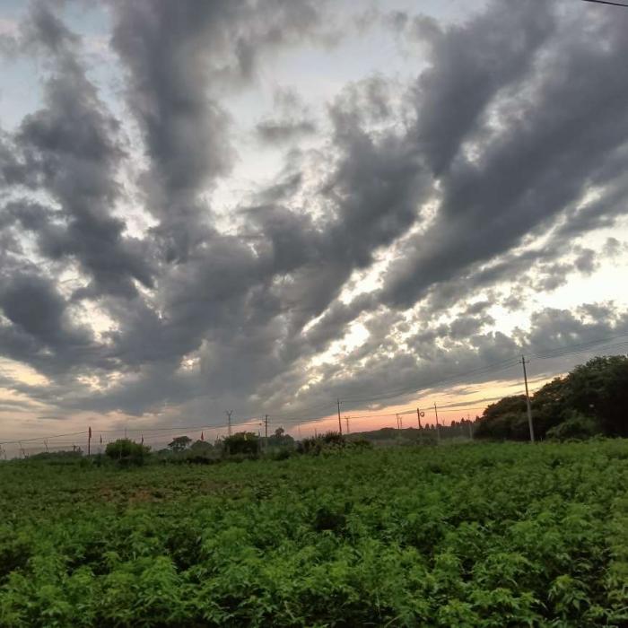 夏日晚霞红红晚霞天际耀,白白云朵炊烟袅