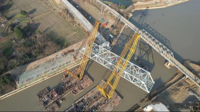 芜申线(溧阳段)回龙桥钢桁梁完成整体吊装