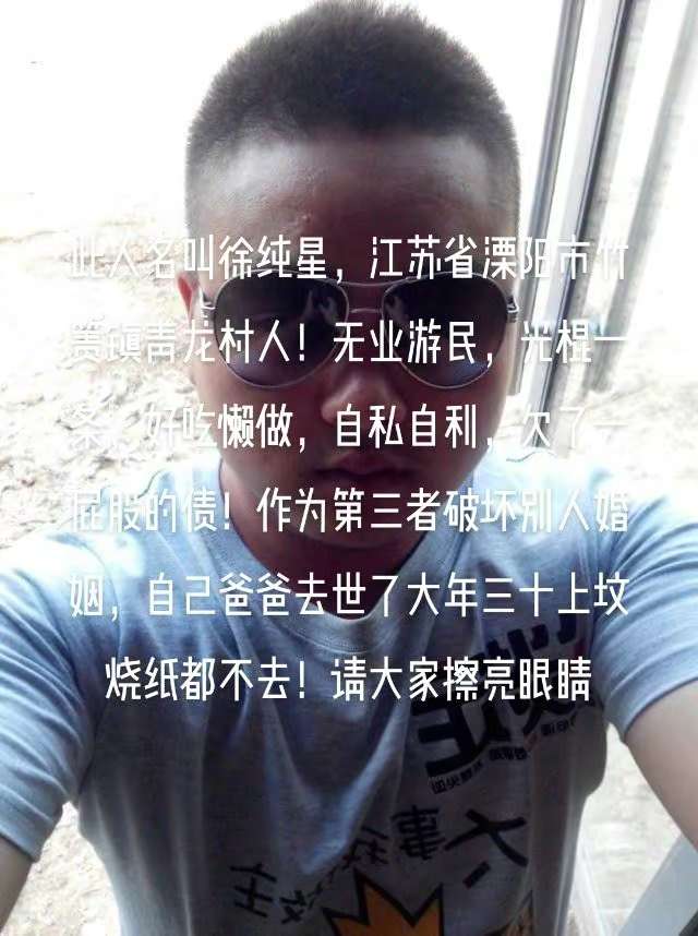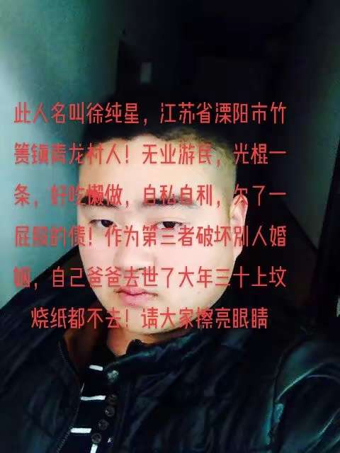 此人名叫徐纯星,溧阳市竹箦镇青龙村人!无业游民,光棍一条,好吃懒做,欠钱不还,听说要债的要到他家里人那去了,还破坏别人家庭!坏事做尽……当然那女的也不是什么好东西,王八对绿豆————对上眼了!一个自己父亲死了大年三十等着他上坟烧纸不去,另一个自己儿子不管不顾!俩人一路货色,自私透顶,为了自己舒服俩人过年都不愿意回家!请大家多多注意!