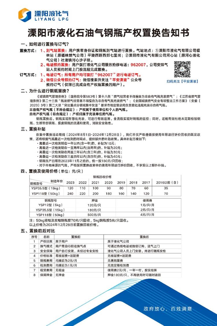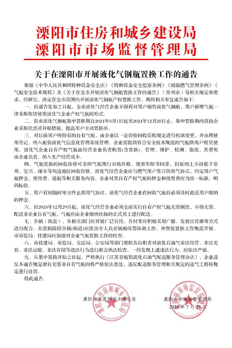 您好!根据政府相关文件,8月1日起在全市范围内开展液化气钢瓶产权置换工作,具体文件内容可查看《关于在溧阳市开展液化气钢瓶置换工作的通告》。
