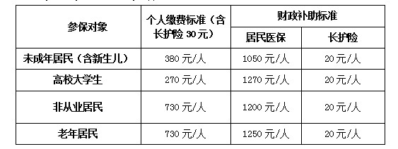 2026年度居民医保(含长护险,其中“未成年居民”长护险个人免缴费)的缴费标准为: