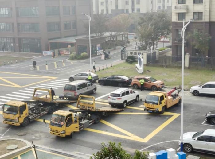 四辆拖车,就问你怕不怕!溧阳蒋店新城门口乱停的车被拖走了