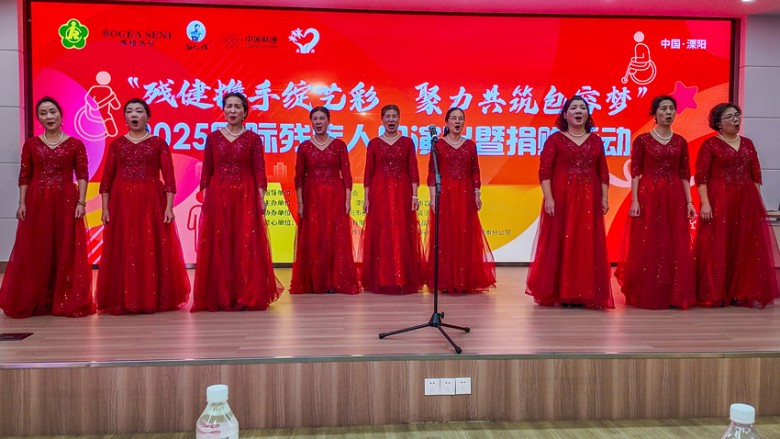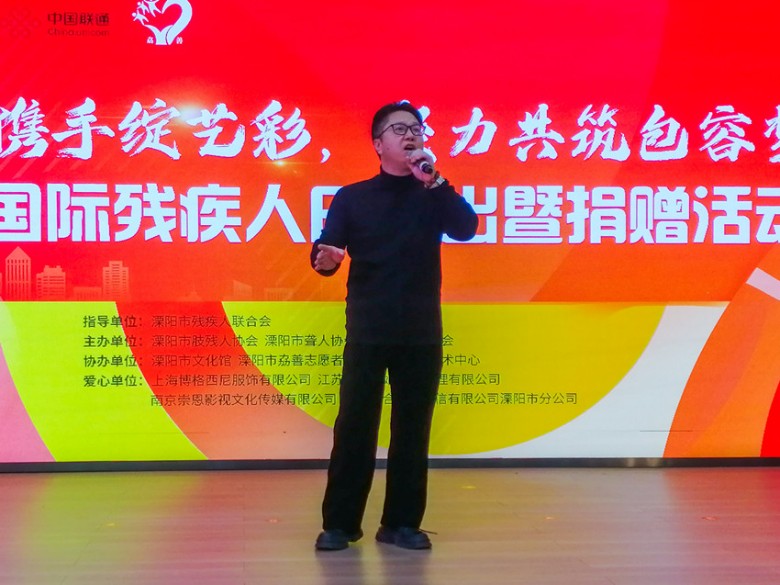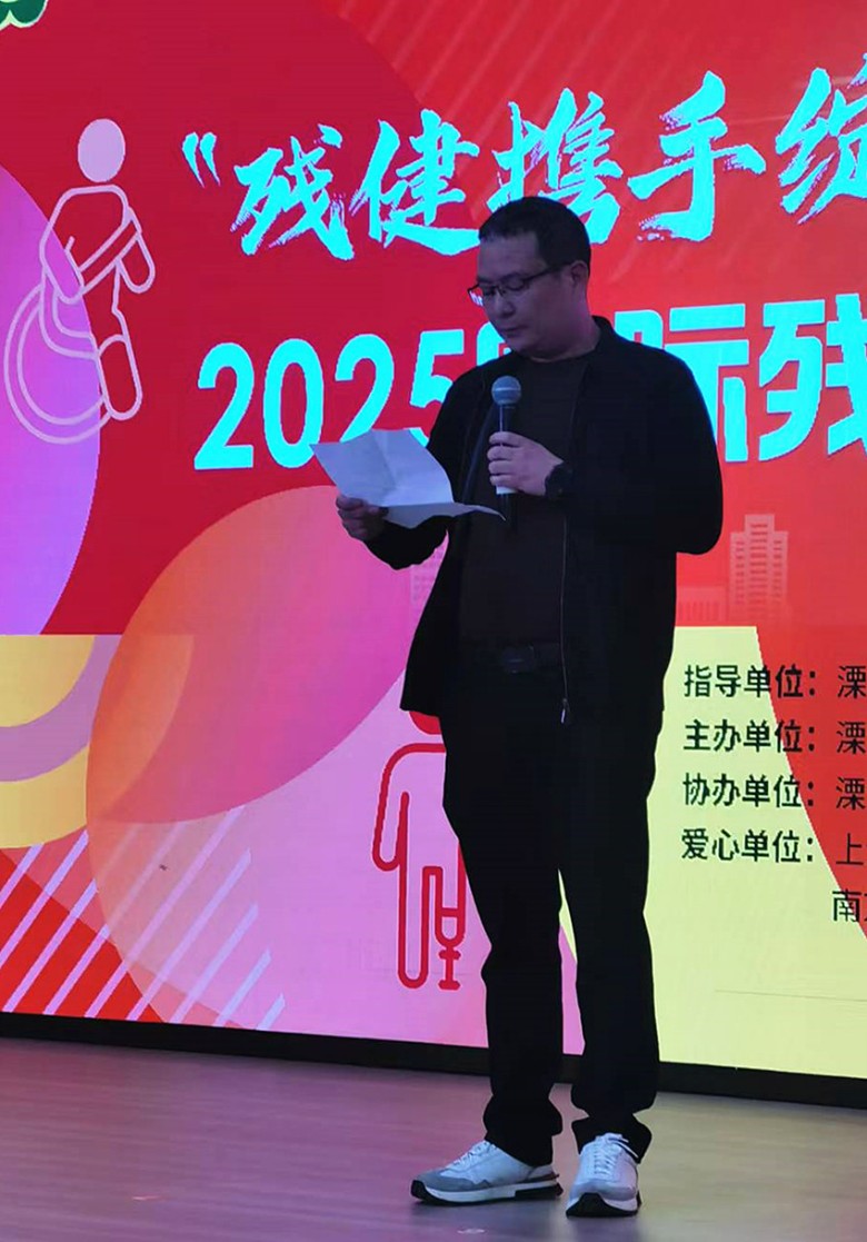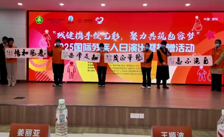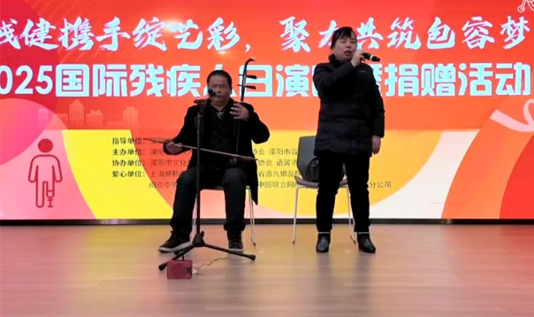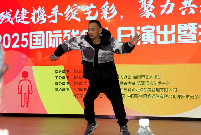 在这国际残疾人日来到之际,溧阳市残疾人联合会除举办“笔绘初心·助残同行”主题书画展外,还指导下属残疾人协会举办了一场“2025国际残疾人日文艺演出暨社会捐赠活动”,全场共演出了10个节目:朱秀娟等人的舞龙、王晓燕2人的朗诵、孔锡生的男声独唱《爸爸的脚》、王德网的街舞、沈洪娣的女声独唱《这世界那么多人》、陈奇的独唱《精忠报国》、陈亚明夫妻《珍珠塔》选段、杨庸的朗诵《苔花》、沈小仙等人的女生小合唱《渔家姑娘在海边》,最后一个压台节目是任建中现场书法表演并伴马娇等人的手语舞表演。