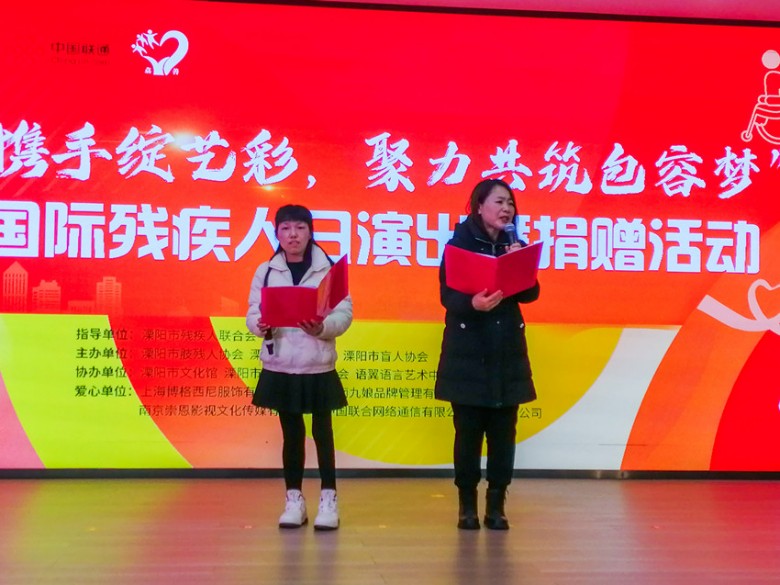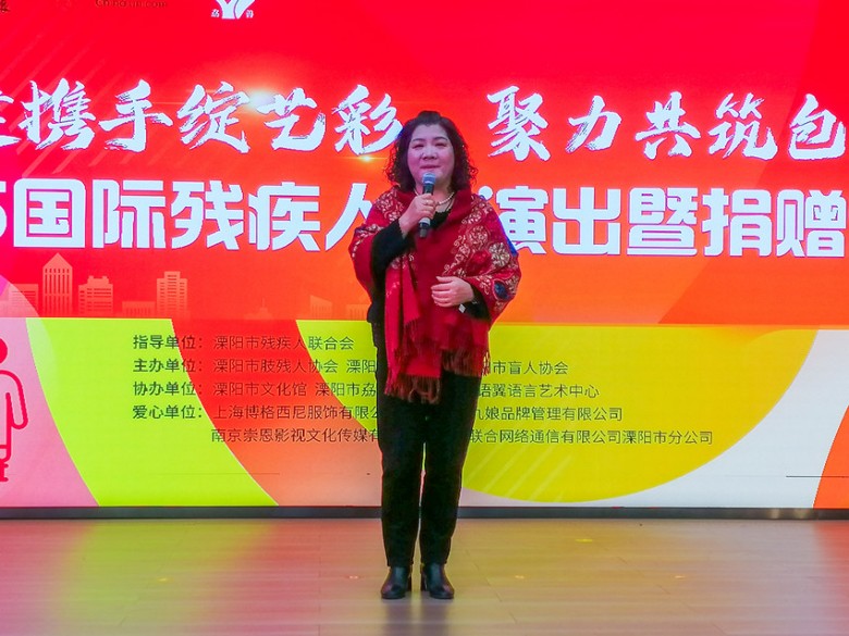 接着,由本次活动的赞助商上海博格西尼服饰有限公司、中国联通公司溧阳分公司领导登台讲话。赞助商除上述两家单位外,还有江苏省卤九娘品牌管理有限公司、南京崇恩影视传媒有限公司等,他们赠送的物品有羊毛衫、盐水鸭、日用品等,尤其是赞助商上海博格西尼服饰有限公司给参加活动的八十多位残障人士每人赠送了一件羊毛衫。
