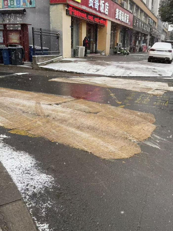 溧阳大雪突至,虽冷但有暖心事,周城时代家园小区大门、主干道铺设了稻草防滑垫,太贴心了。这些看似朴素的稻草垫,在雪天里为大家筑牢了安全防线。有效防止了行人滑倒和车辆打滑,保障大家出行安全。大雪天出门看到地上铺了稻草,心里一下子就踏实了。
