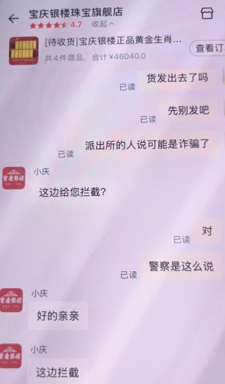 民警查看她的网购记录发现,一笔寄送到广东东莞的黄金还未投递,立即联系了东莞警方,将该笔黄金及时拦截并寄回城中派出所。