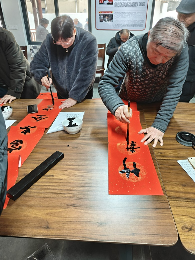 这些溧阳诗人、书法家们在丁社长、王院长的指挥下,二十位诗人和书画家在现场吟诗联、写春联。一场即兴书春雅聚在厅堂启幕。诗人与书法家围桌而坐,红纸铺展,墨香漫溢。诗人凝思片刻便出口成章,七言春联信手拈来,或贺岁纳福,或咏颂新春,字字凝练含情。这边吟罢,那边书法家已然蘸饱浓墨,提笔落纸间笔力遒劲,楷书端庄大气,行书飘逸灵动,隶书古拙厚重。笔锋起落带起墨韵流转,红纸映着黑字,喜庆又雅致。