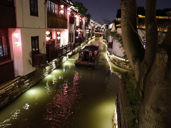 山塘街食美景更美,尤其是夜景更迷人。河道两边高高挂着的一排排大红灯笼亮起,倒映水中,巨画漫铺,如梦如幻,游船穿梭,欢声笑语,好一派国泰民安的江南风情。