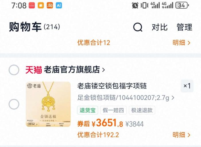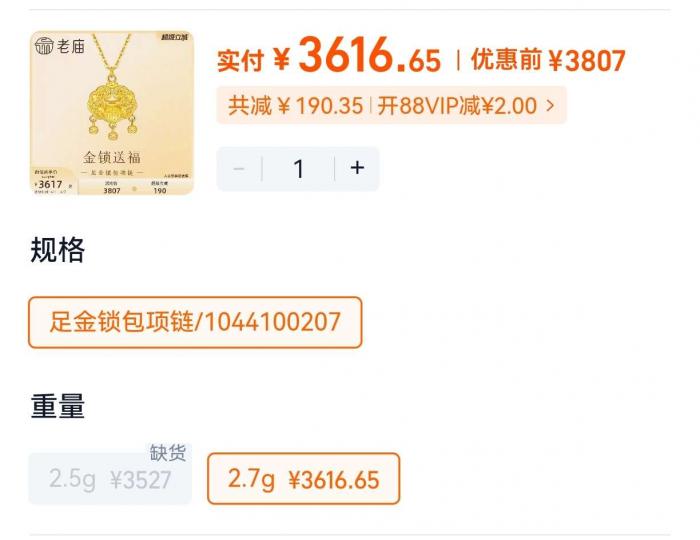 价格欺诈/误导消费:以下均为品牌天猫官方旗舰店、购买当日同款在售实物信息,同款全套足金项链+吊坠共2.7克,官方到手价仅3600出头;线下门店单独一个吊坠就售价3900+,溢价达70%,价格虚高欺诈,薅客。