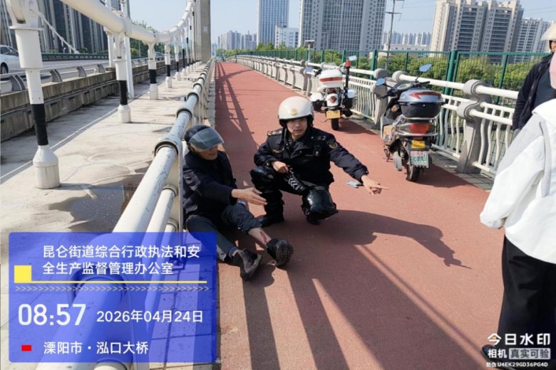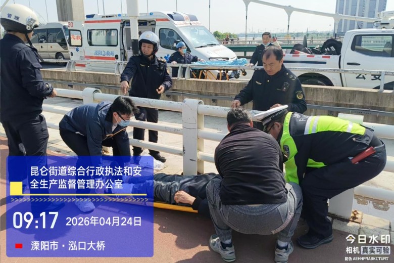 2026年4月24日上午8时50分许,溧阳市昆仑街道泓口大桥上发生一起电瓶车相撞事故,现场有人员受伤。正在附近执勤的城管中关村中队队员沈焕东、任欣、杨晨亮、郑大伟第一时间发现情况,迅速跑上前查看伤者伤势,并立即协助拨打110和120求助。